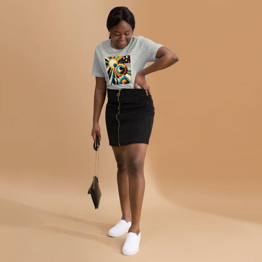 A bold abstract space composition featuring a radiant sun, layered circular forms and stylised celestial bodies in a retro-inspired palette. Teal, mustard, cream and burnt orange shapes create a striking geometric moon arrangement with cosmic line art details and starry accents.