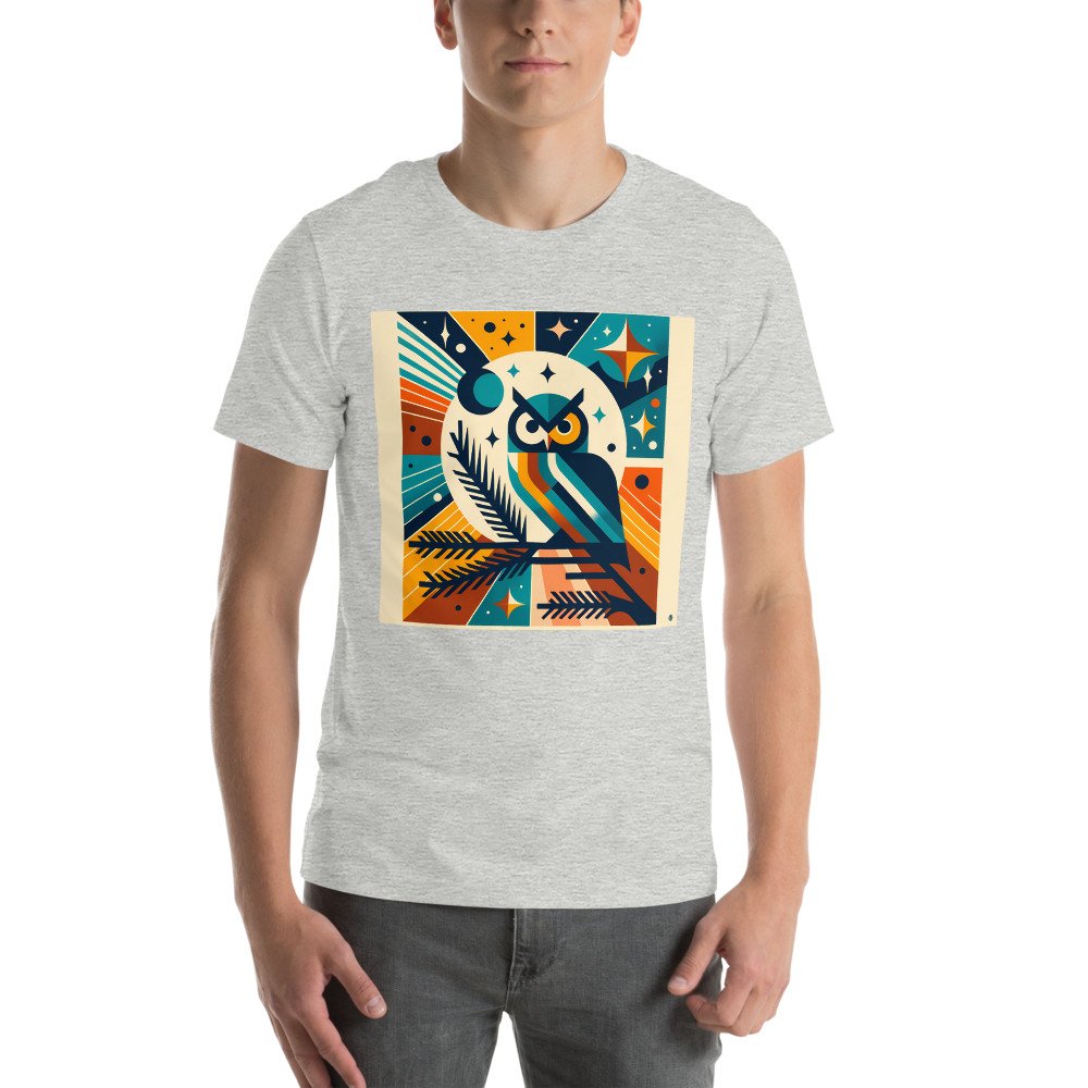 Geometric Owl Under Moon and Stars — T-Shirt