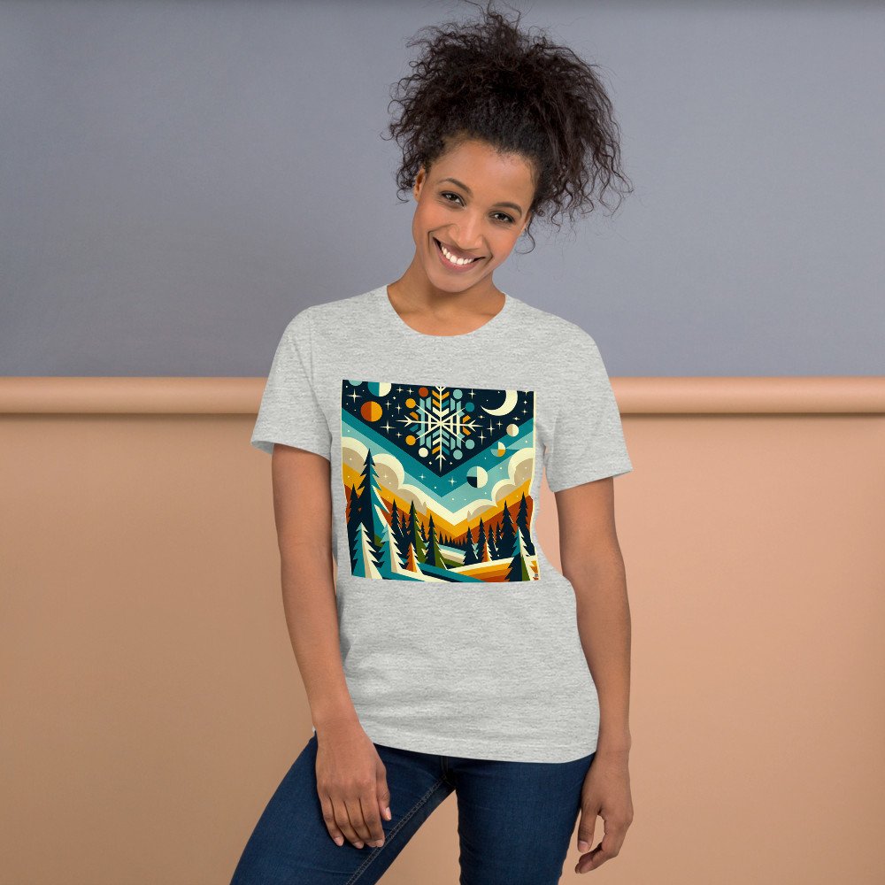 A large geometric snowflake glows above layered mountains and stylised pine trees beneath a crescent moon and scattered stars. The design uses a cold colour palette of teal, cream and golden orange with crisp angular shapes. It blends winter minimalist styling with abstract snowflakes for a bold seasonal composition.