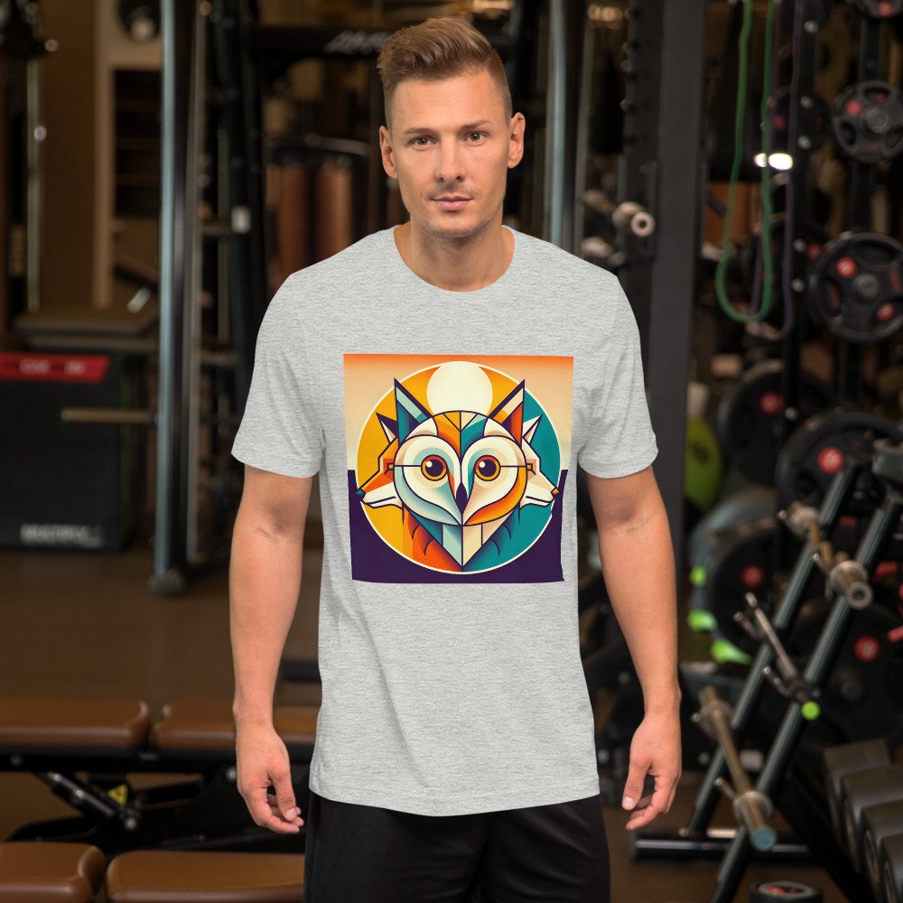 A symmetrical geometric portrait merges an owl and fox into a bold circular composition. Sharp angular shapes, clean linework and soft grain shading create a modern wildlife illustration. Teal, orange and cream tones frame the owl-like eyes and fox-inspired silhouette with a glowing sun backdrop.