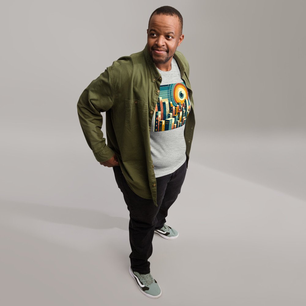 Geometric Cityscape with Circular Eye Sun — T-Shirt
