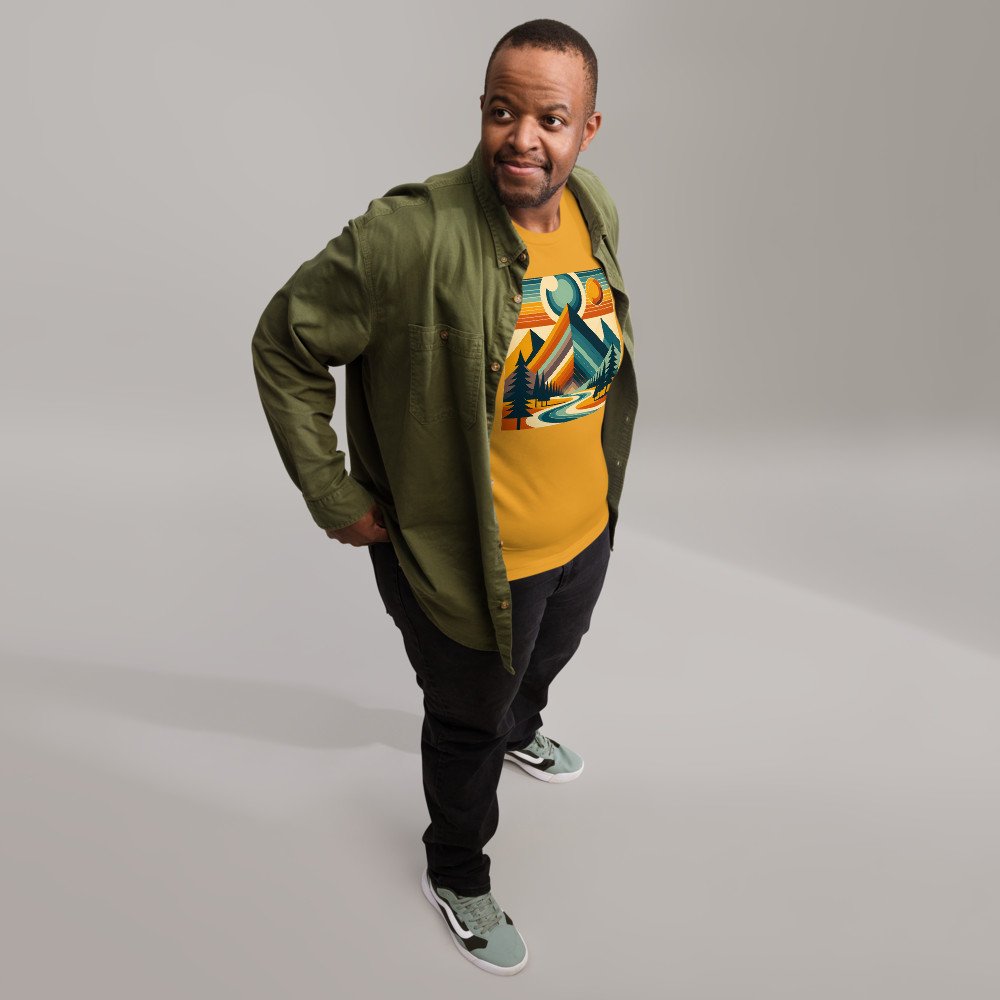 A bold geometric landscape featuring layered mountain peaks, tall pine silhouettes and a winding river beneath circular suns. The composition blends warm orange and gold tones with cool teal shades for a striking abstract mountains scene. Clean lines and balanced shapes give it a minimal mountains aesthetic with a retro-inspired finish.
