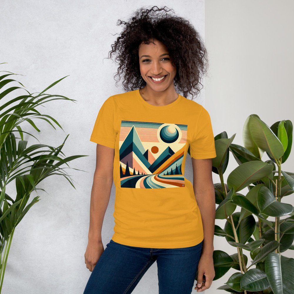 A bold geometric mountains scene with layered triangular peaks, a curving road, and a glowing sun and moon composition. Clean lines, grainy shading, and warm retro tones create a striking triangle landscape with a minimal outdoors feel.