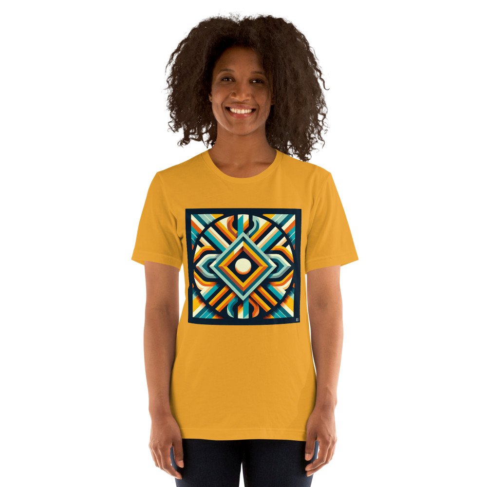A symmetrical abstract composition built from layered diamond shapes, sweeping arcs and a glowing central circle. Teal, orange, cream and navy create a striking retro palette with crisp contrast and depth. The design has the impact of bold typography and modern type poster styling, translated into pure geometric form.