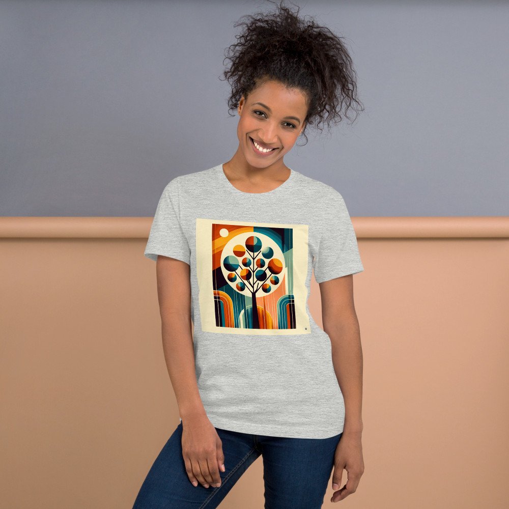 This relaxed-fit tee in premium ringspun cotton carries the bold retro composition. The geometric tree, with its teal and orange abstract shapes, brings a crisp, graphic look to casual wear, its layered arches creating a striking modernist silhouette.