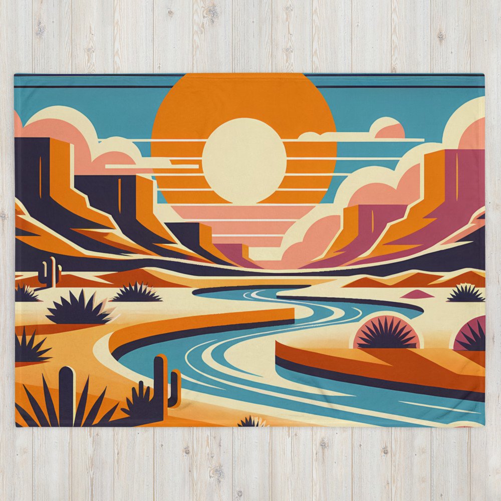 Geometric Desert Sunset with River and Canyons — Throw Blanket