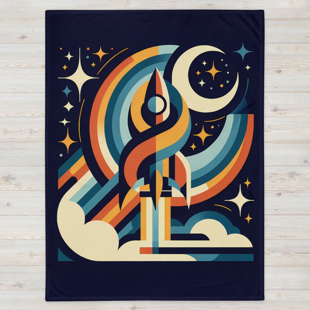 Retro Rocket Launch with Rainbow Trails — Throw Blanket