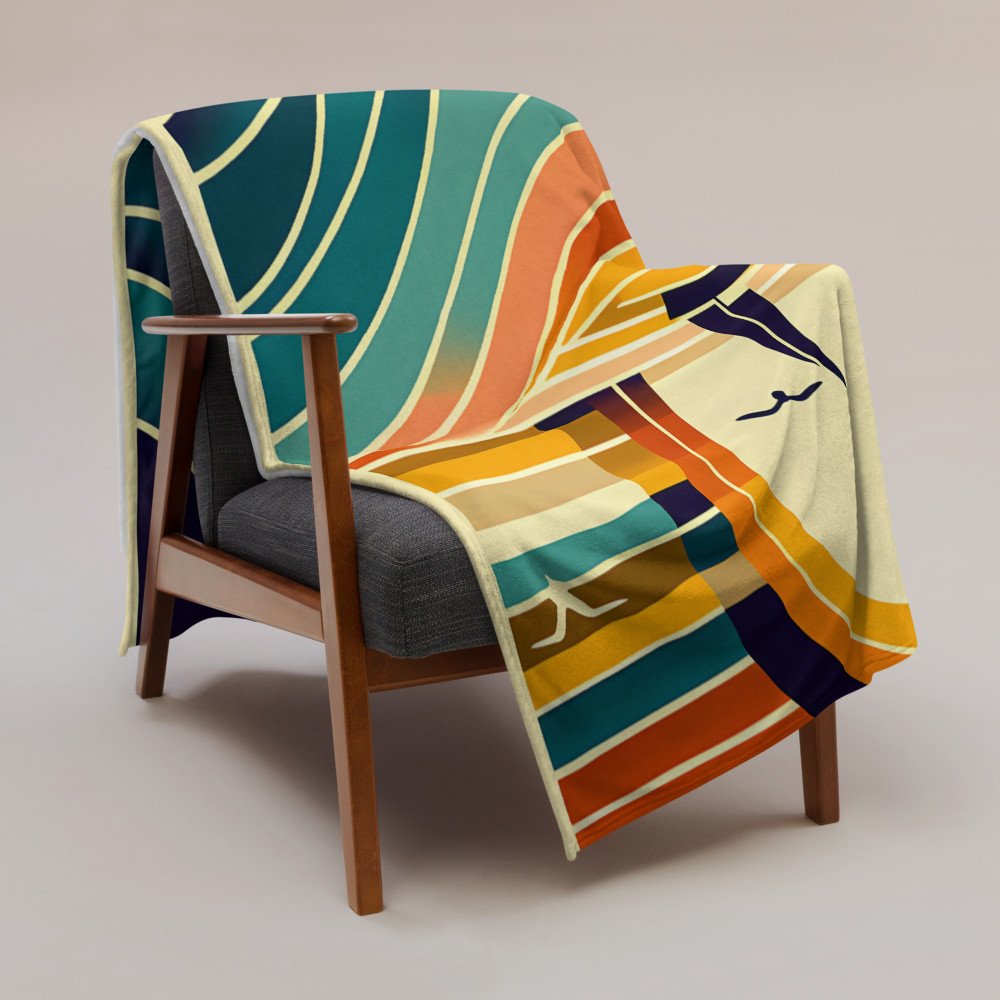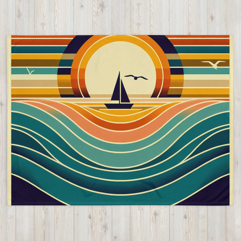 Geometric Sunset Sailboat Over Colour-Block Waves — Throw Blanket