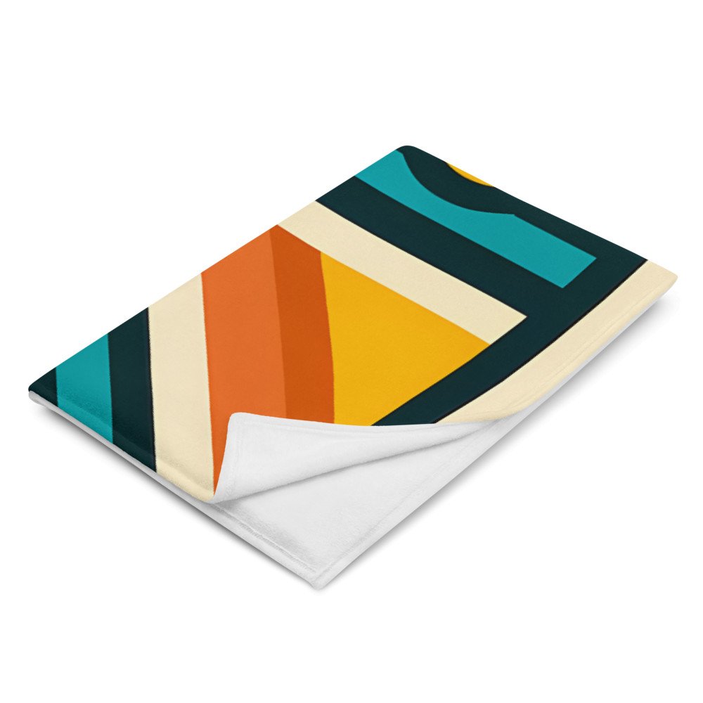 A bold geometric composition featuring a stylised sun, radiating striped rays and layered wave forms in teal, orange, cream and golden yellow. Thick outlines and circular shapes create a striking mid-century feel with a clean graphic text art sensibility. The balanced symmetry and saturated palette give it the look of modern type poster styling without any lettering.