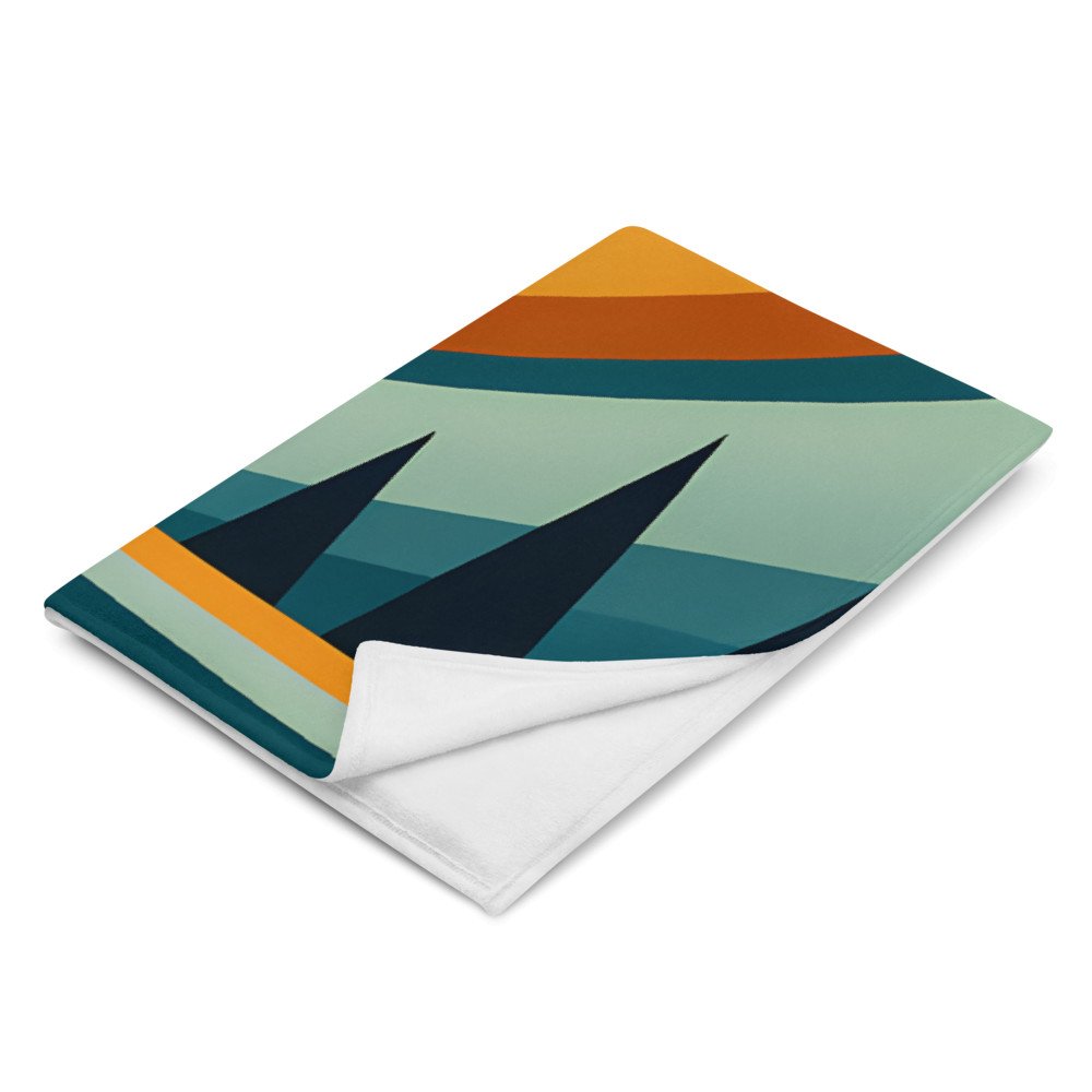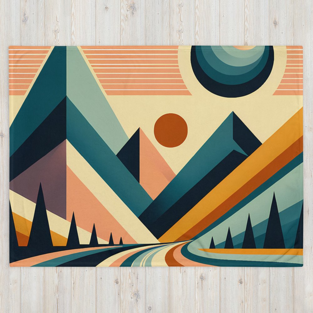 A bold geometric mountains scene with layered triangular peaks, a curving road, and a glowing sun and moon composition. Clean lines, grainy shading, and warm retro tones create a striking triangle landscape with a minimal outdoors feel.