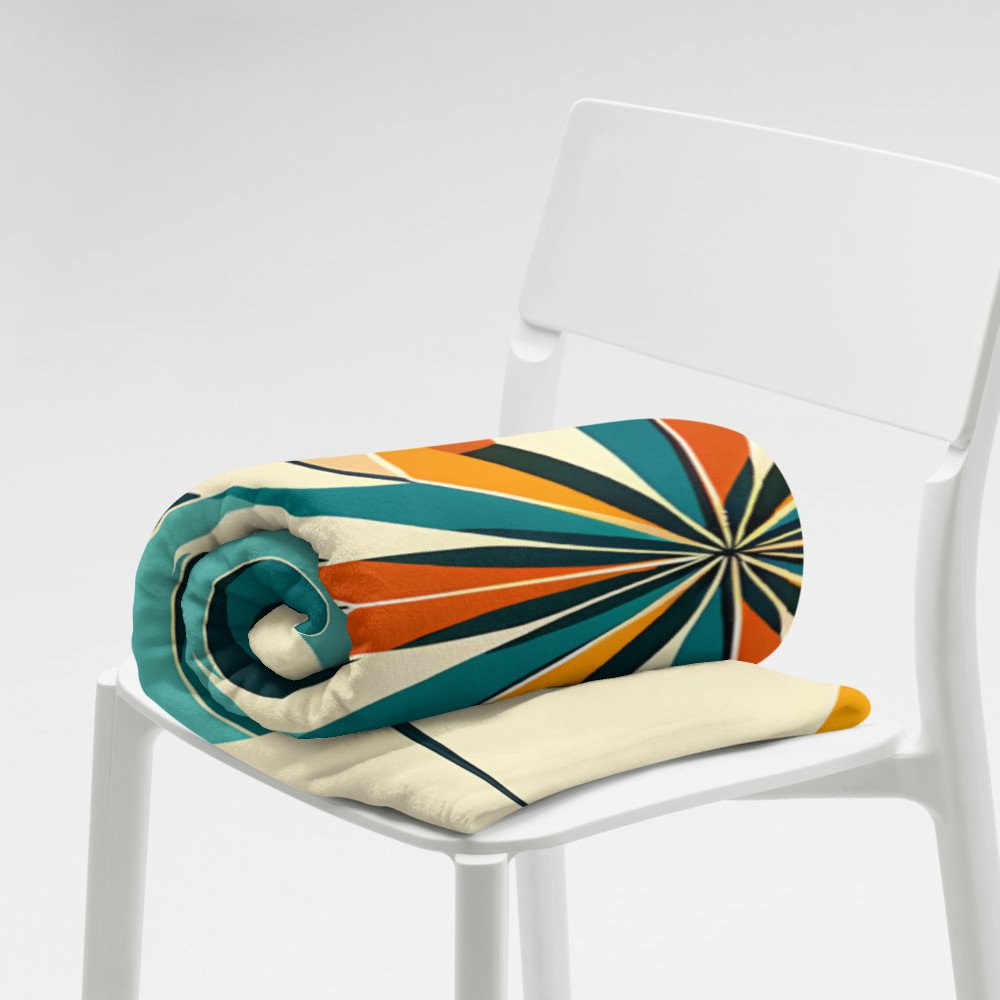 A bold geometric snowflake radiates from the centre against layered sunset bands and stylised pine trees. The design blends ice crystal geometry with a retro palette of teal, cream, amber and burnt orange. Clean symmetry and sharp angular shapes give it a striking winter pattern feel.