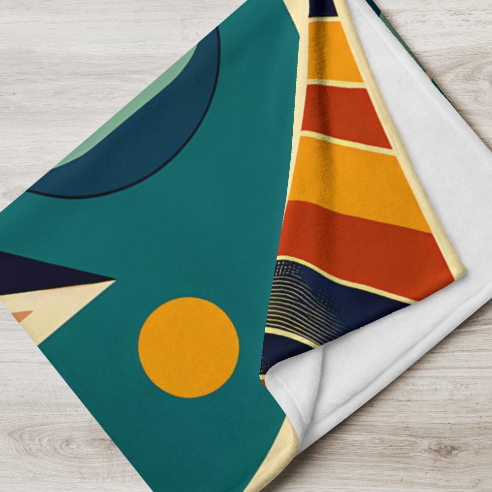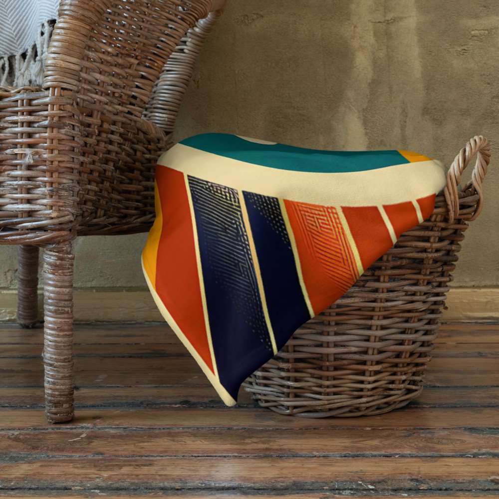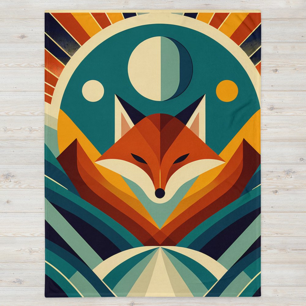 A stylised fox portrait is built from bold geometric shapes, layered arcs and radiant lines. Warm orange and cream tones contrast with deep teal and navy, creating a balanced wildlife composition beneath a moonlit sky. The symmetrical layout gives this fox design a sleek, modern feel.
