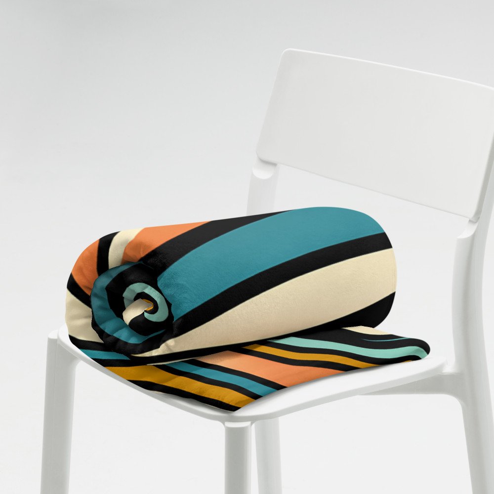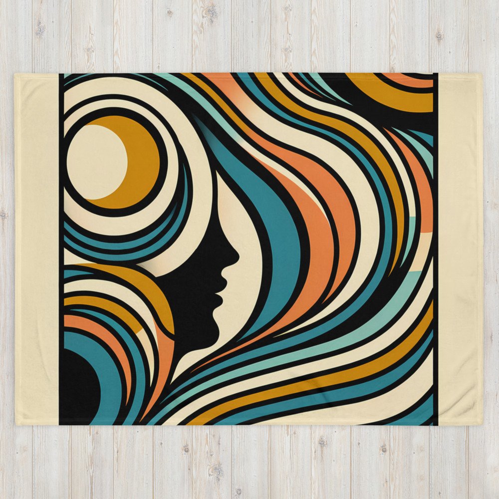 A stylised female profile emerges from flowing bands of teal, mustard, cream and coral. The design blends abstract portrait line elements with bold retro curves and a clean modern minimal feel. Strong black outlines and circular forms create a striking one line art inspired composition.