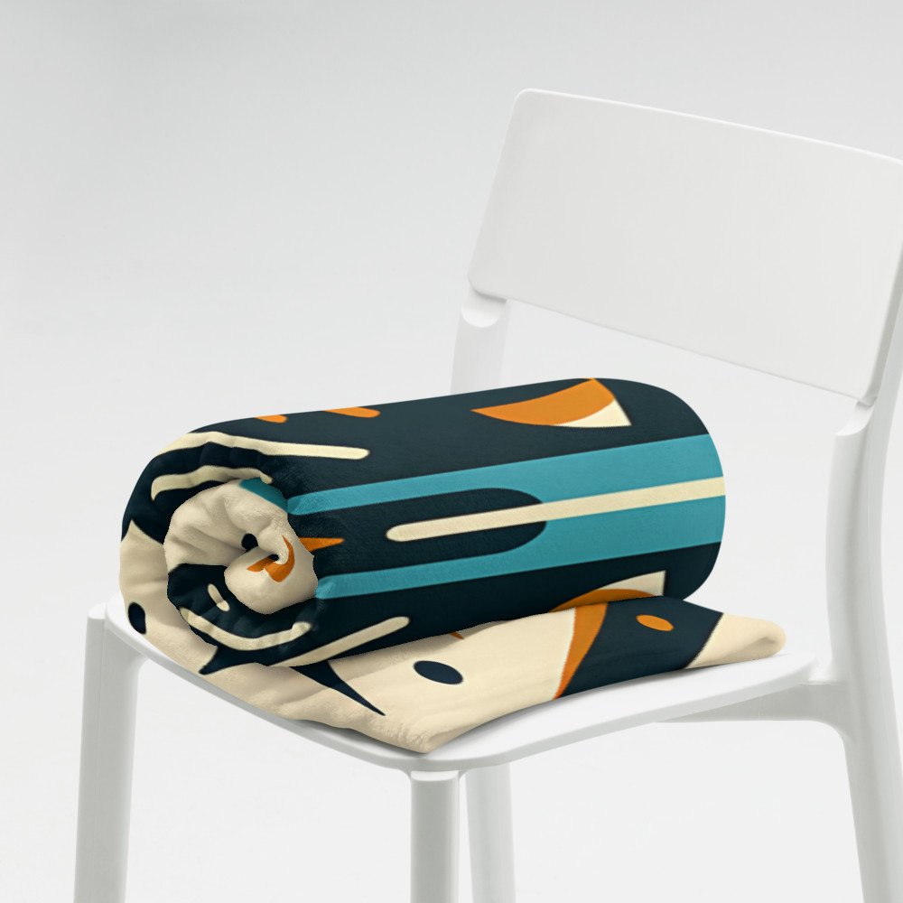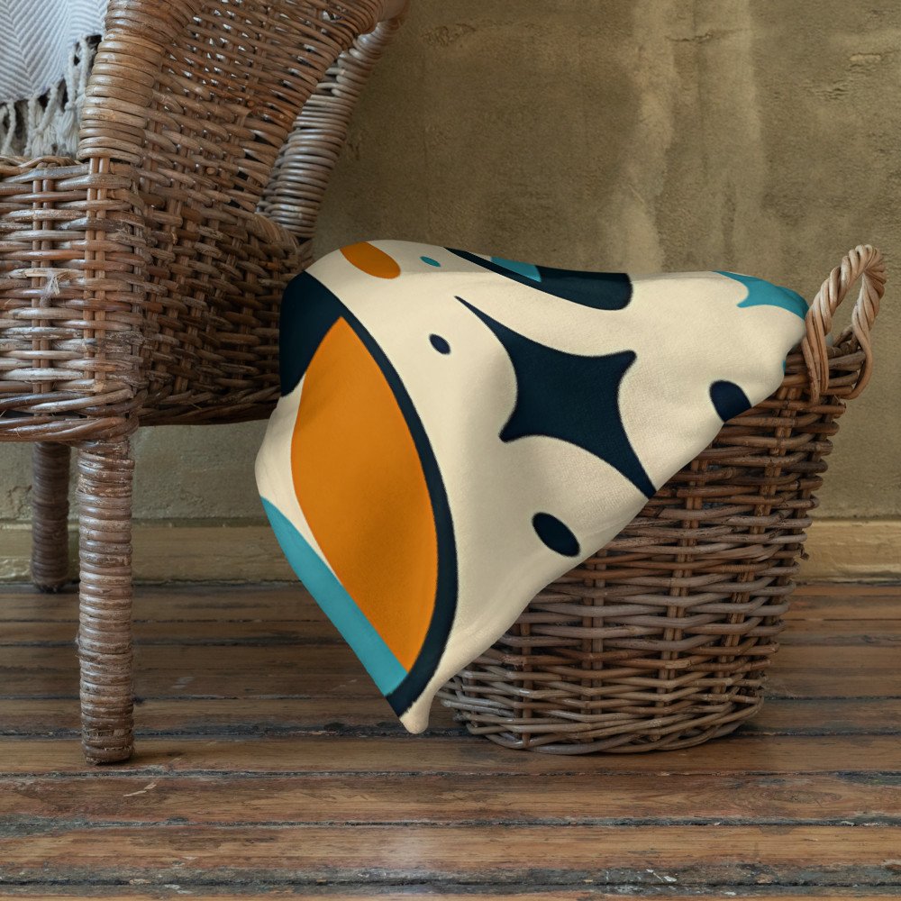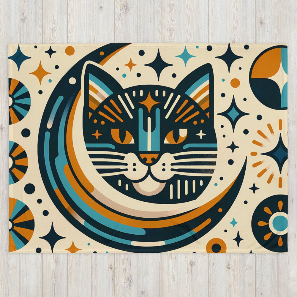 A stylised cat face sits within a crescent moon, surrounded by stars, dots and circular motifs in teal, orange and black. The bold graphic uses simple shapes and high contrast art to create a playful celestial composition with a retro-modern feel.