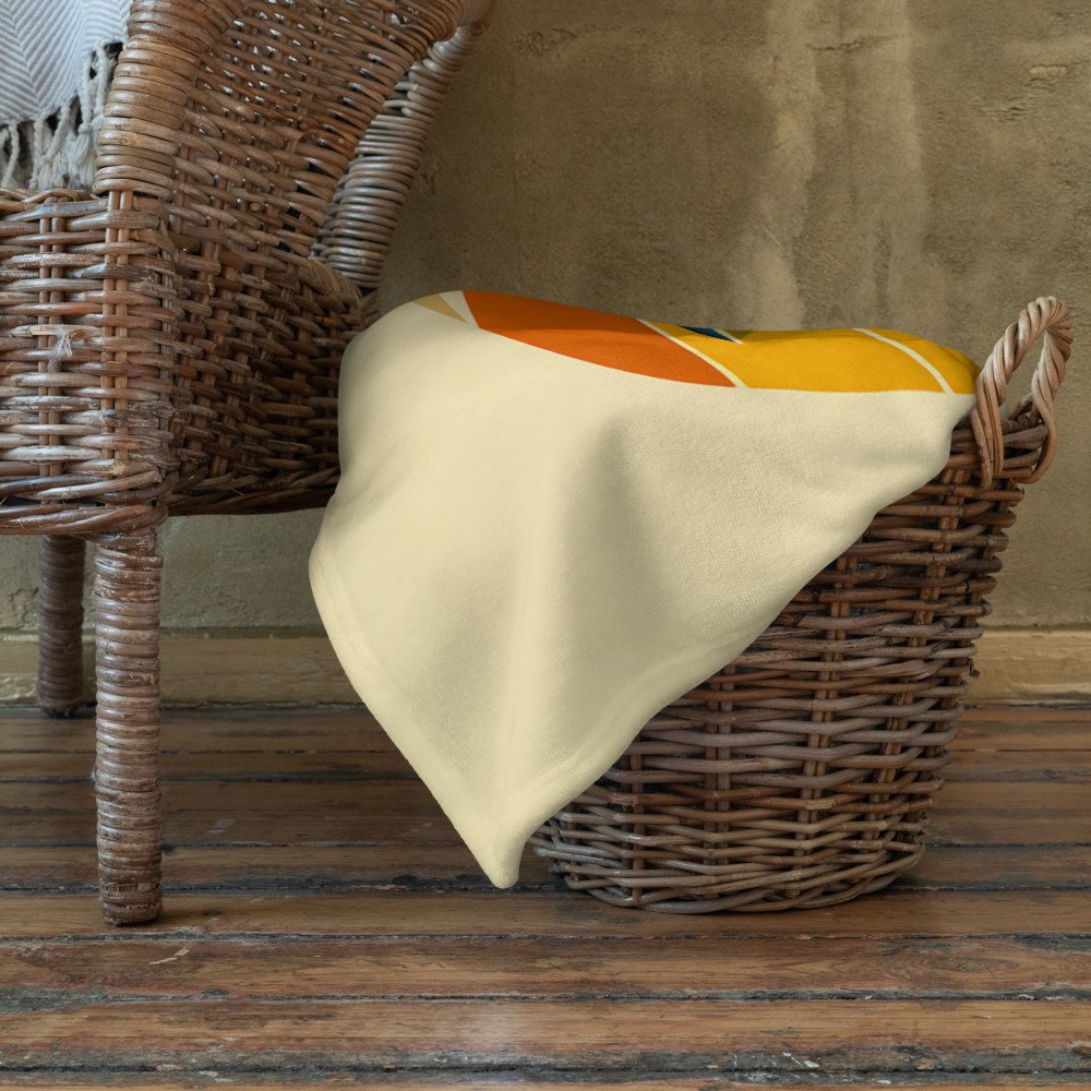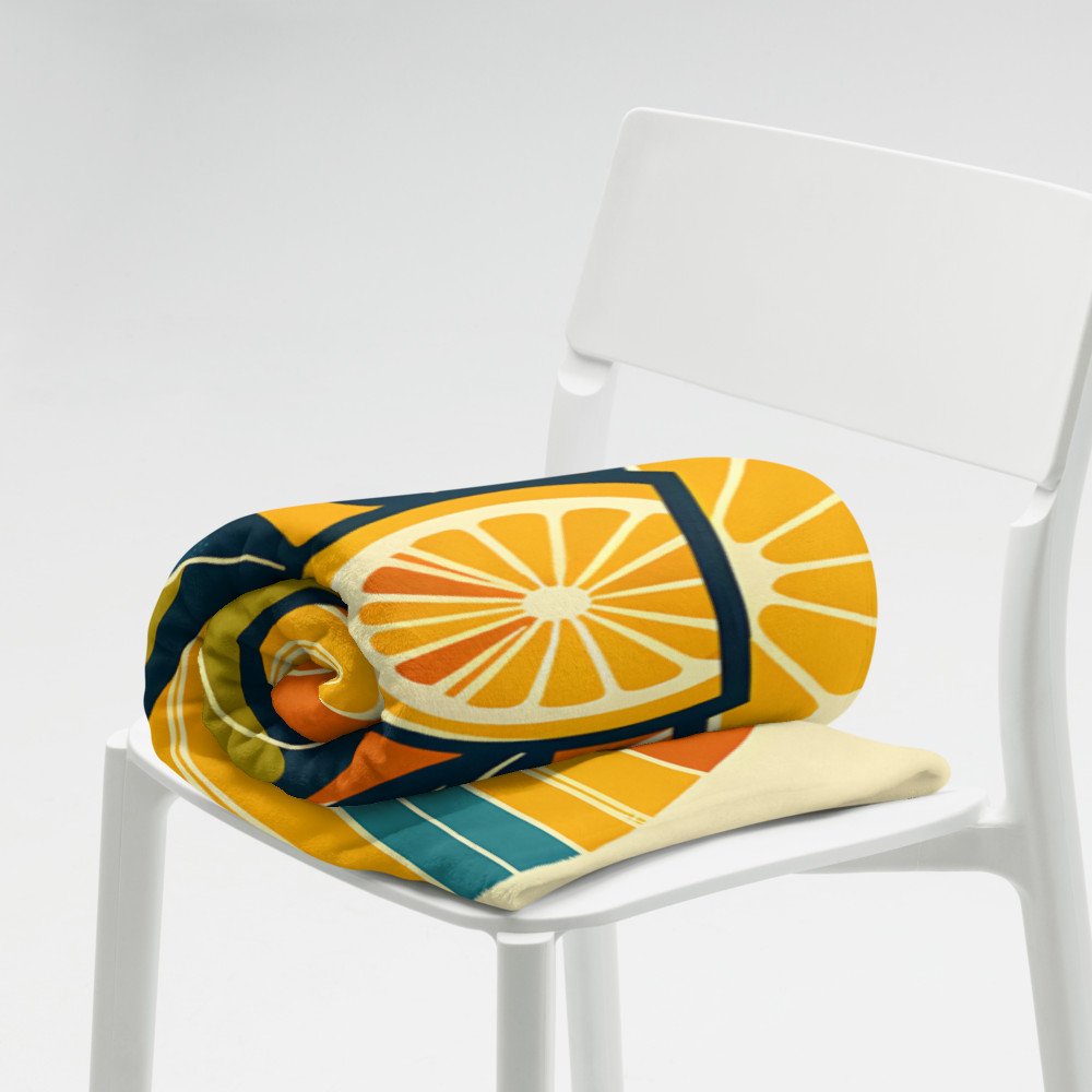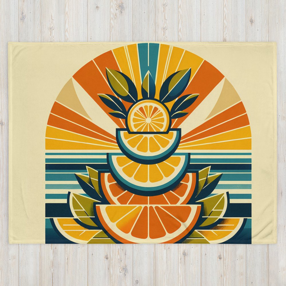 A bold citrus composition of stacked orange and lemon slices with stylised leaves and radiant sunburst lines. The layered shapes and warm palette give it a playful food illustration feel with strong abstract fruit art energy. Teal accents and geometric striping add a crisp vintage graphic finish.